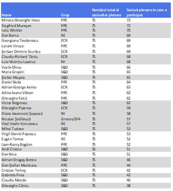 Echipa Europuls a realizat, în cadrul platformei RO33înUE, un clasament al europarlamentarilor români în funcție de numărul de voturi la care au fost prezenți în plen, de la începutul mandatului și până în prezent, dintr-un total de 3.975 de sesiuni de vot. Tabelul de mai jos oferă o imagine comparativă asupra nivelului de participare la vot al acestora.