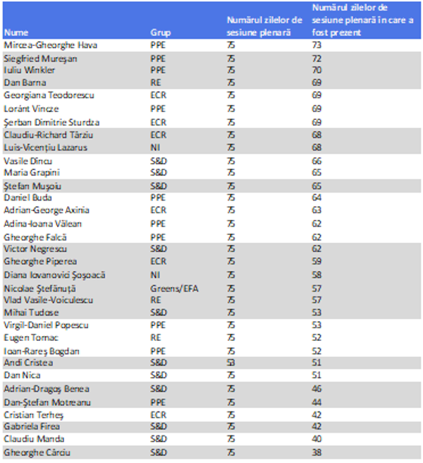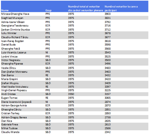 Echipa Europuls a realizat, în cadrul platformei RO33înUE, un clasament al europarlamentarilor români în funcție de numărul de voturi la care au fost prezenți în plen, de la începutul mandatului și până în prezent, dintr-un total de 3.975 de sesiuni de vot. Tabelul de mai jos oferă o imagine comparativă asupra nivelului de participare la vot al acestora.